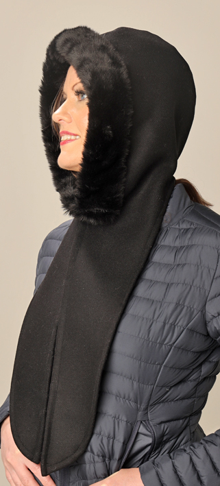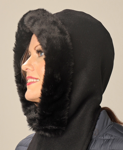 Reunus minkkijäljitelmää, huppu villasekoitekangasta ja vuori puuvillakangastaVärivaihtoehdot: musta ja ruskea
