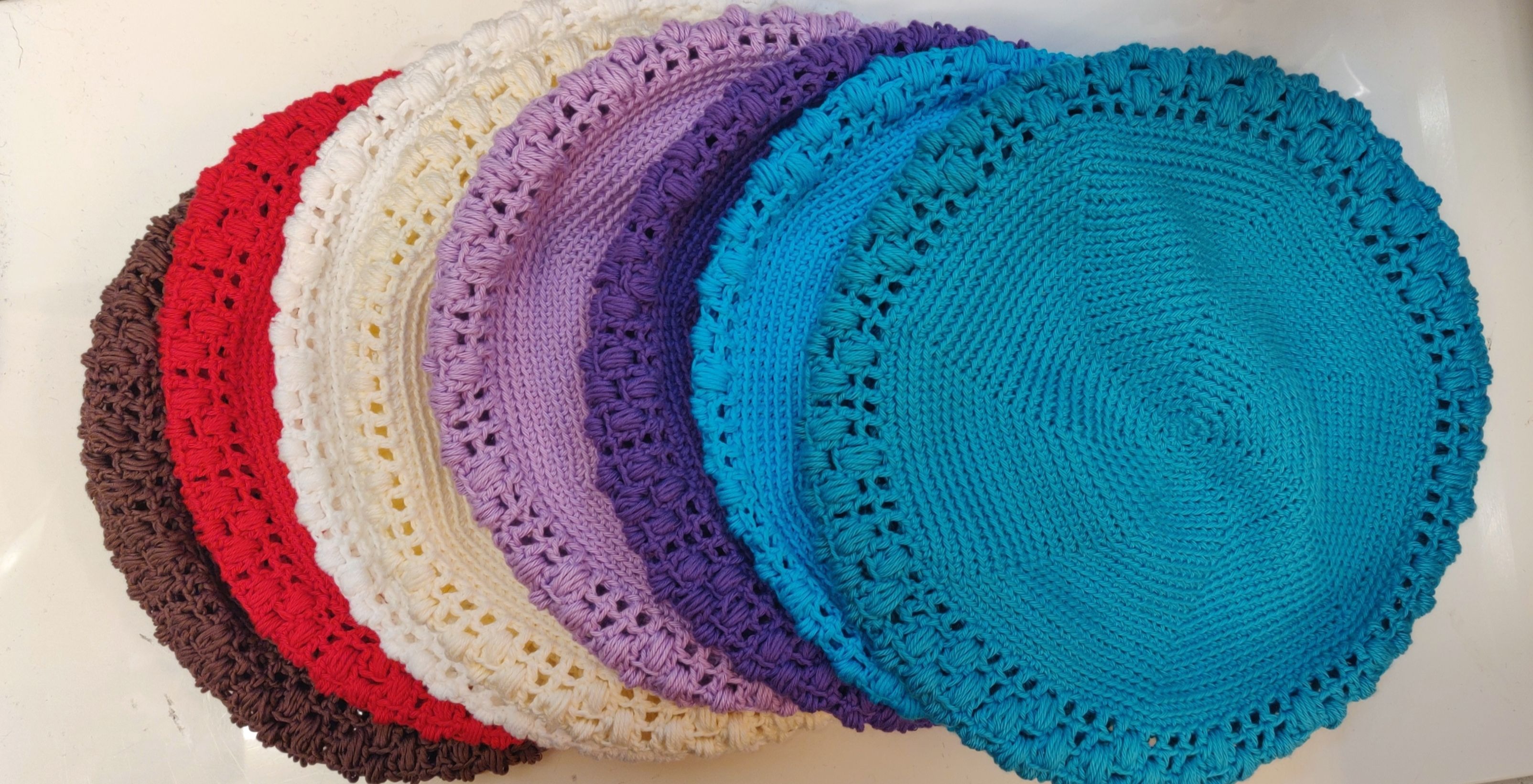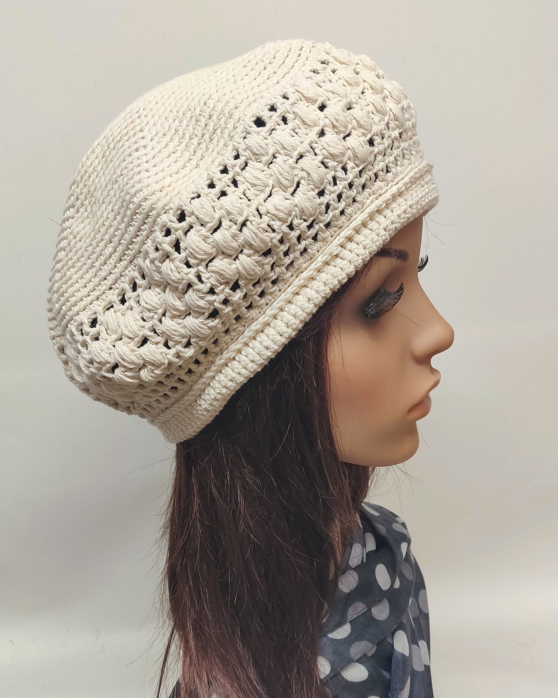 Kotimainen käsin virkattu pehmeä puuvillaneulebaskeri kauniilla koristekuviolla.