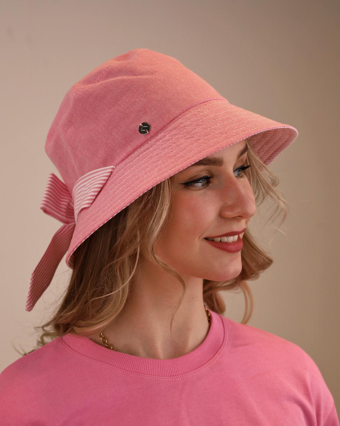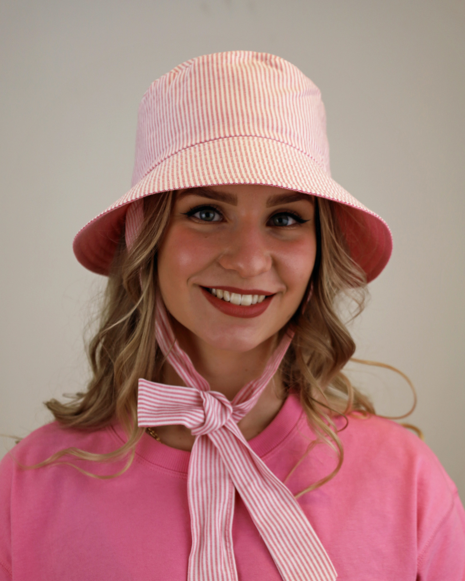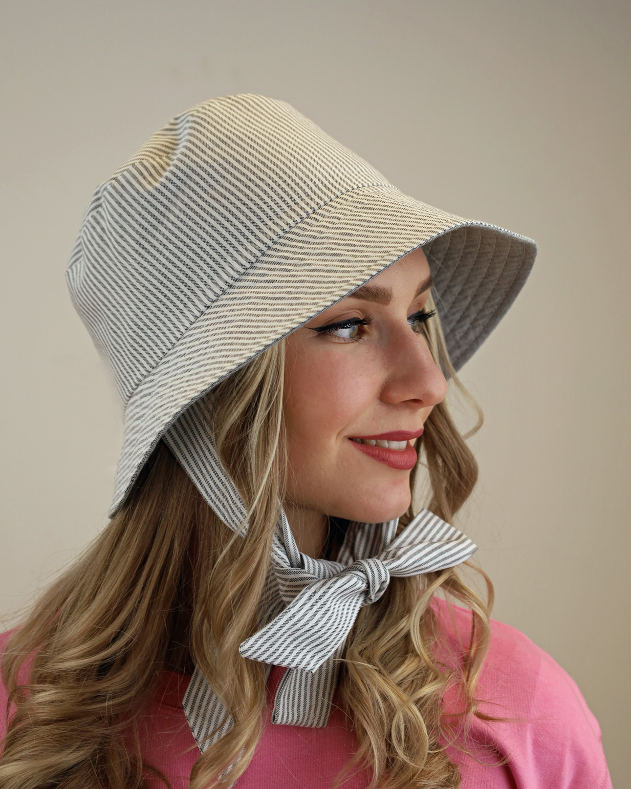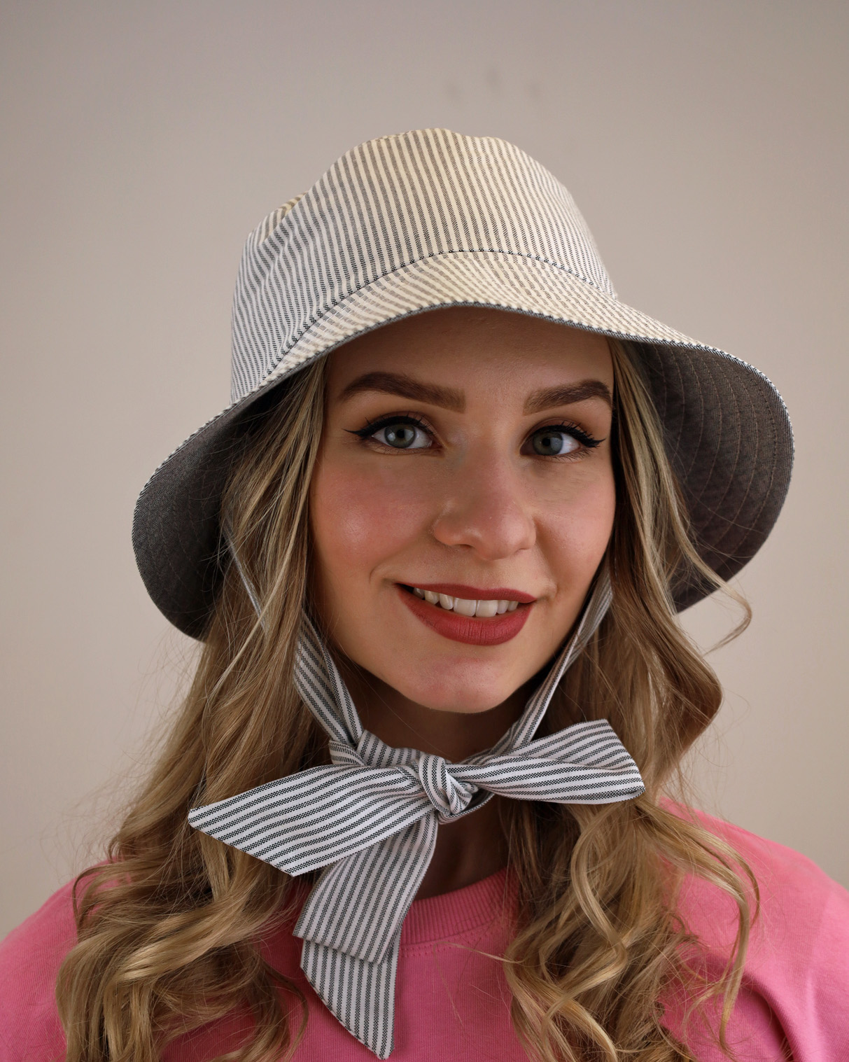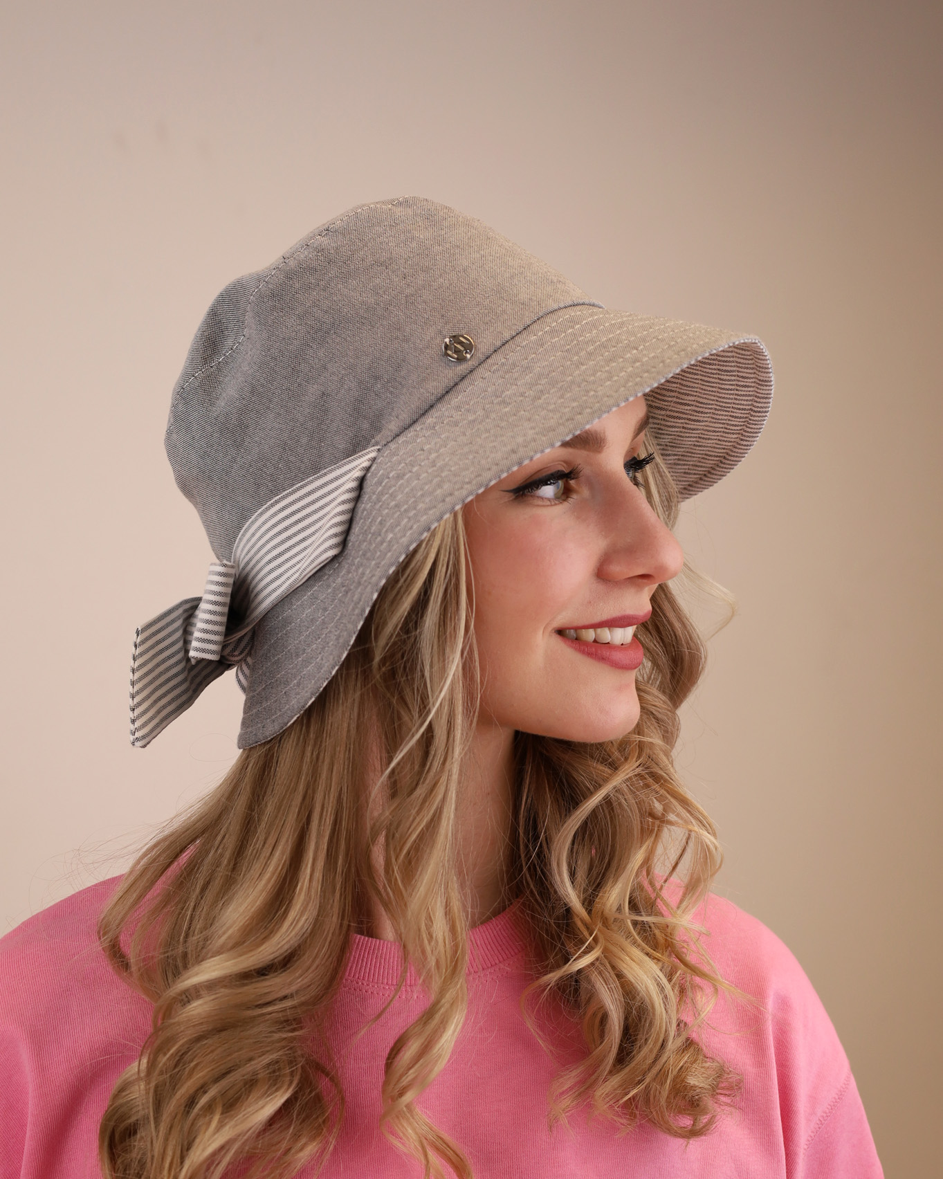 Sievä kesälakki jonka voit myös kääntää. Toinen puoli yksivärinen ja toinen valkoraidallinen.