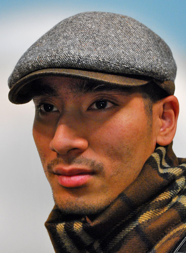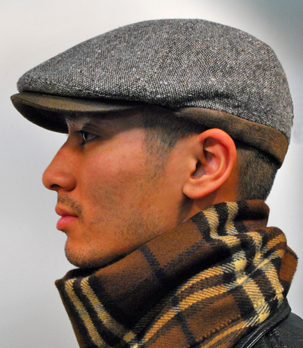 Kapea ja pienilippainen tweed-lippis Italiasta. Lippa on ruskeaa keinonahkaa.