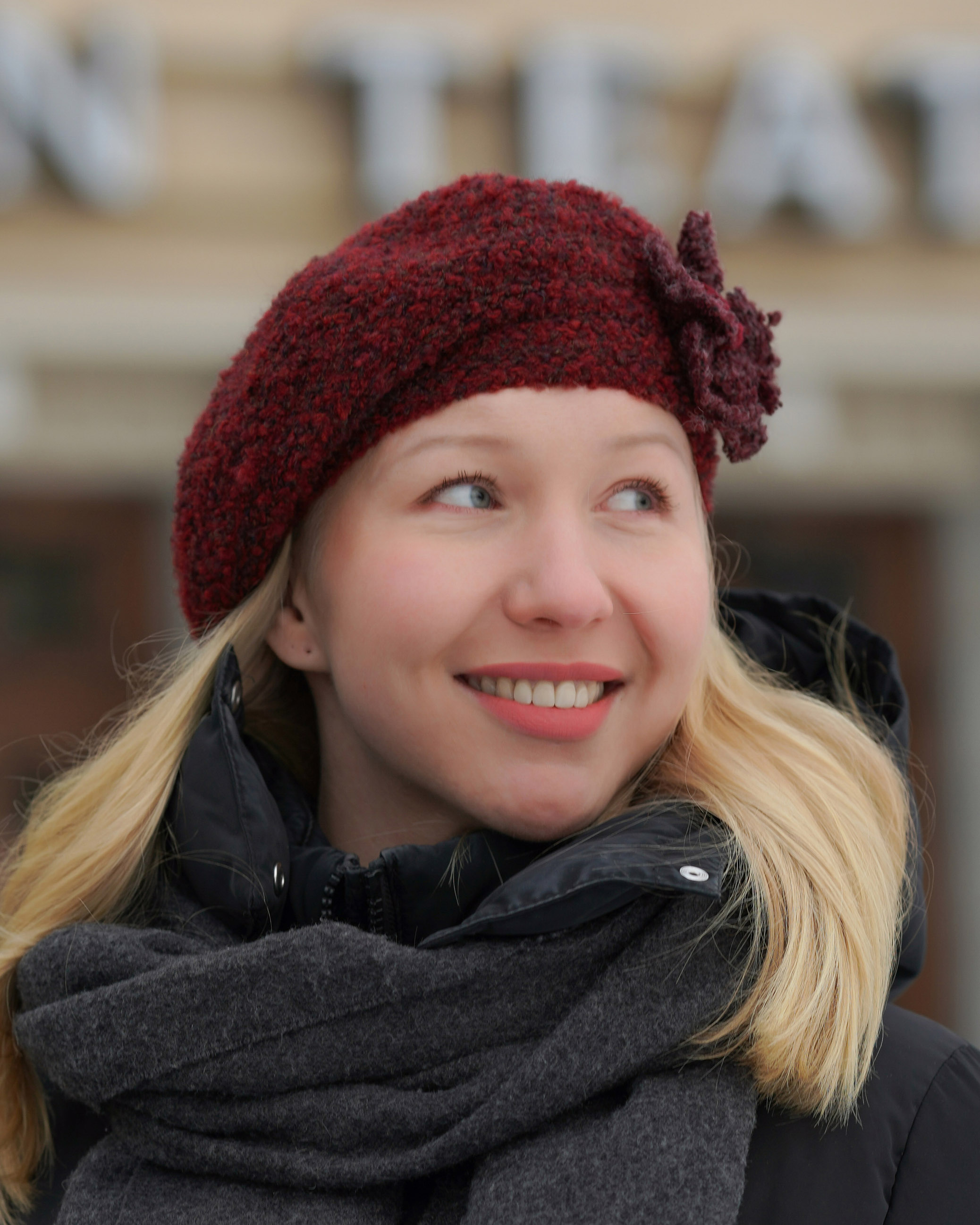 Italialainen bukleepintainen baskeri. Kuvun läpimitta noin 27 cm. Värivaihtoehdot: musta-valkoinen, terra-ruskea ja viininpunainen. Koot M ja L. Materiaali 44%PC, 31%WO, 11%WP, 8%PL, 6% PA