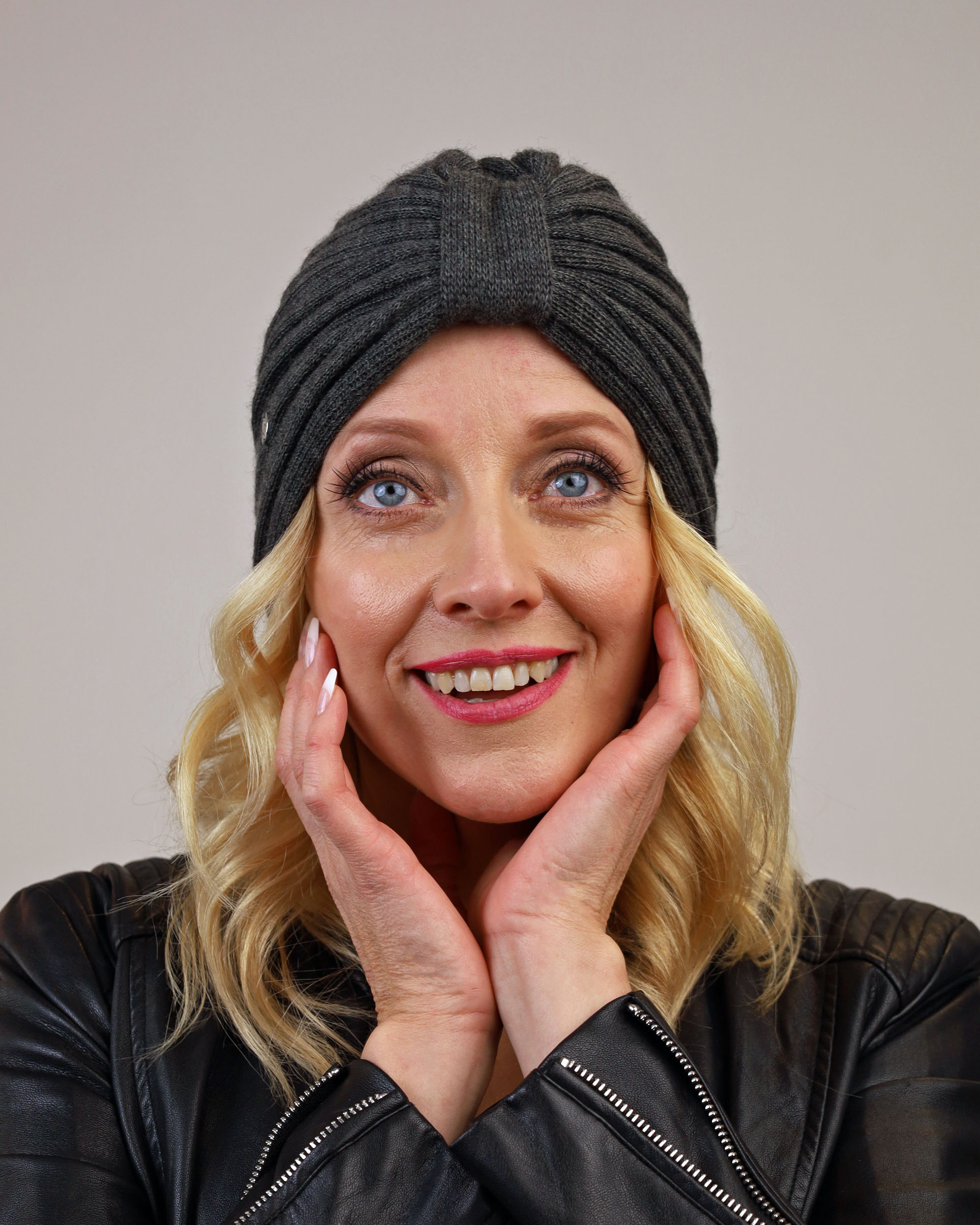 Stylish, comfortable and modern turban hat from Italy. Beautiful fit.Colors: beigeMaterial: 50% wool and 50% acrylic