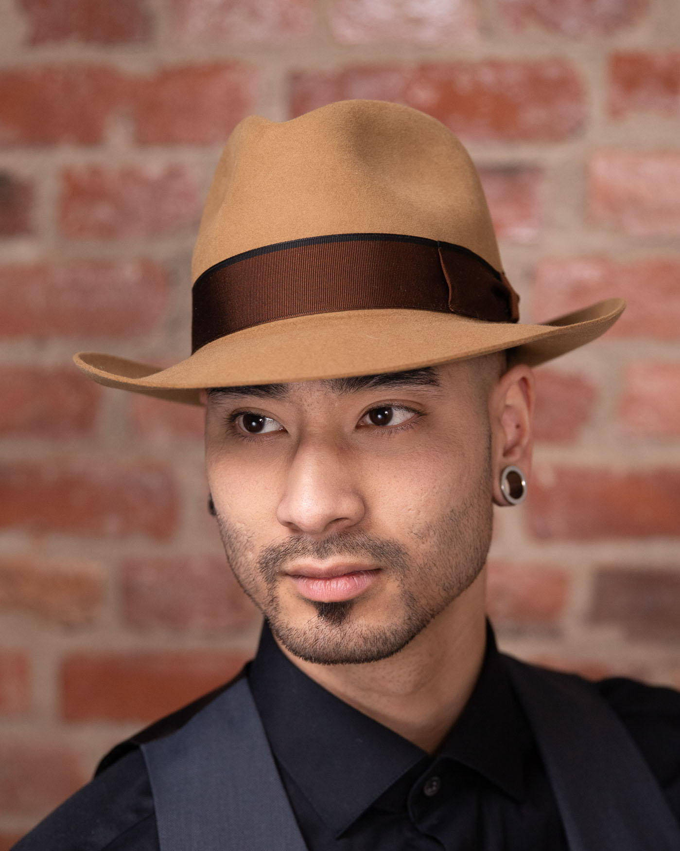 Hieno laadukkaasta hiushuovasta Espanjassa valmistettu Fedora-hattu camel-värisenä. Tässä huopahatussa on vuori!