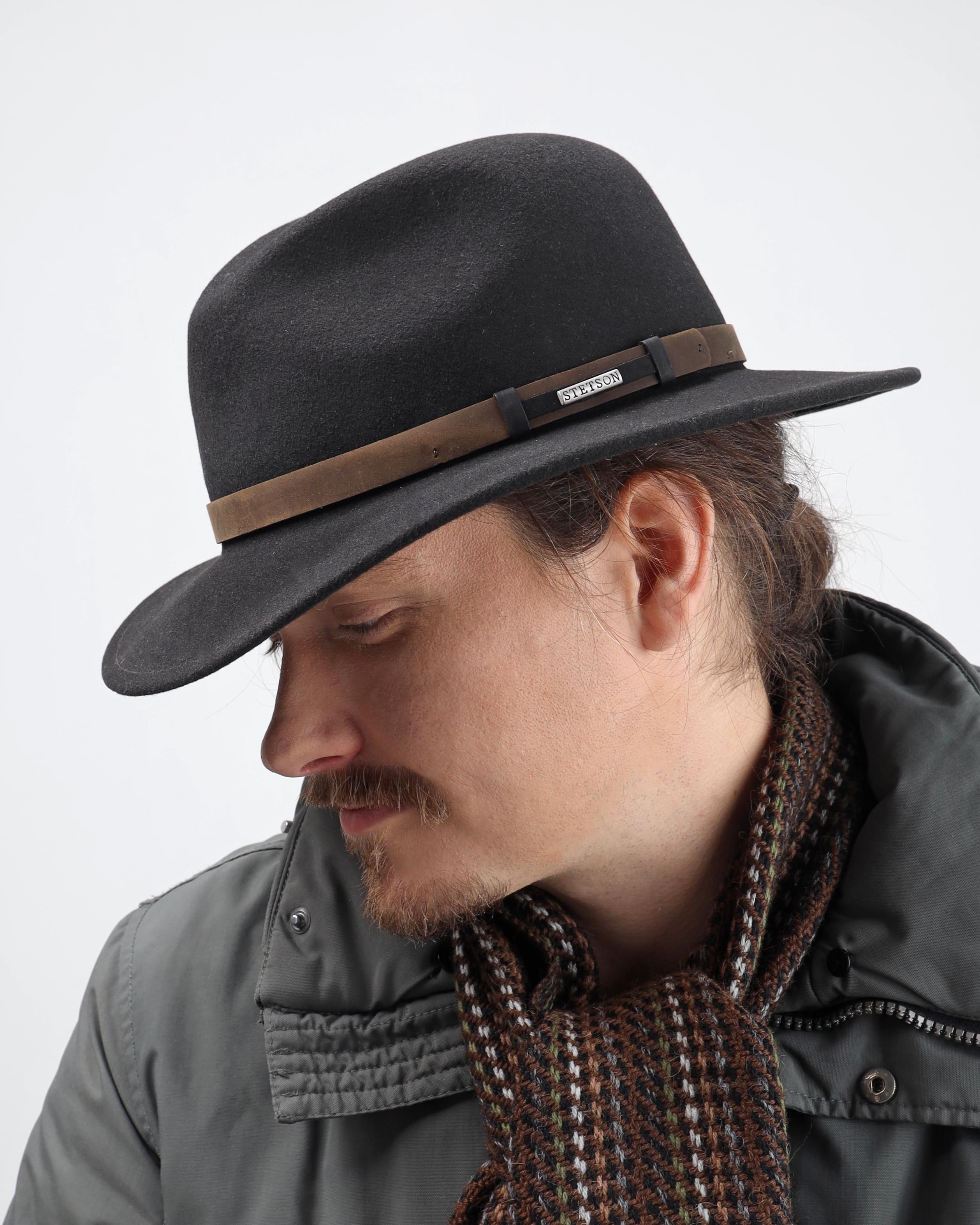 Aito Stetson-huopahattu. Reipas "katustetson". Laadukas VitaFelt-materiaali kestää niin sateet kuin rullauksenkin.